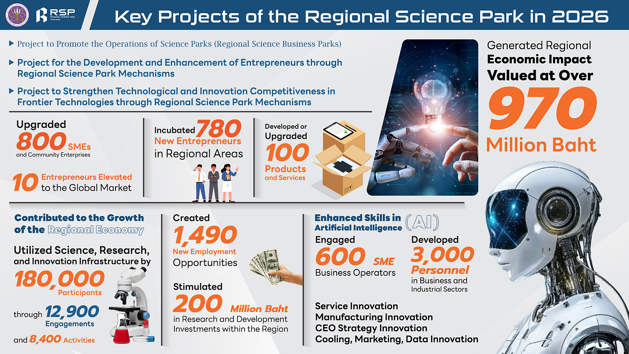 In 2026, the Regional Science Parks continue to play a vital role in advancing Thailand’s regional innovation ecosystem. Through three strategic projects, the parks empower entrepreneurs, strengthen technology competitiveness, and promote sustainable economic growth across the country.