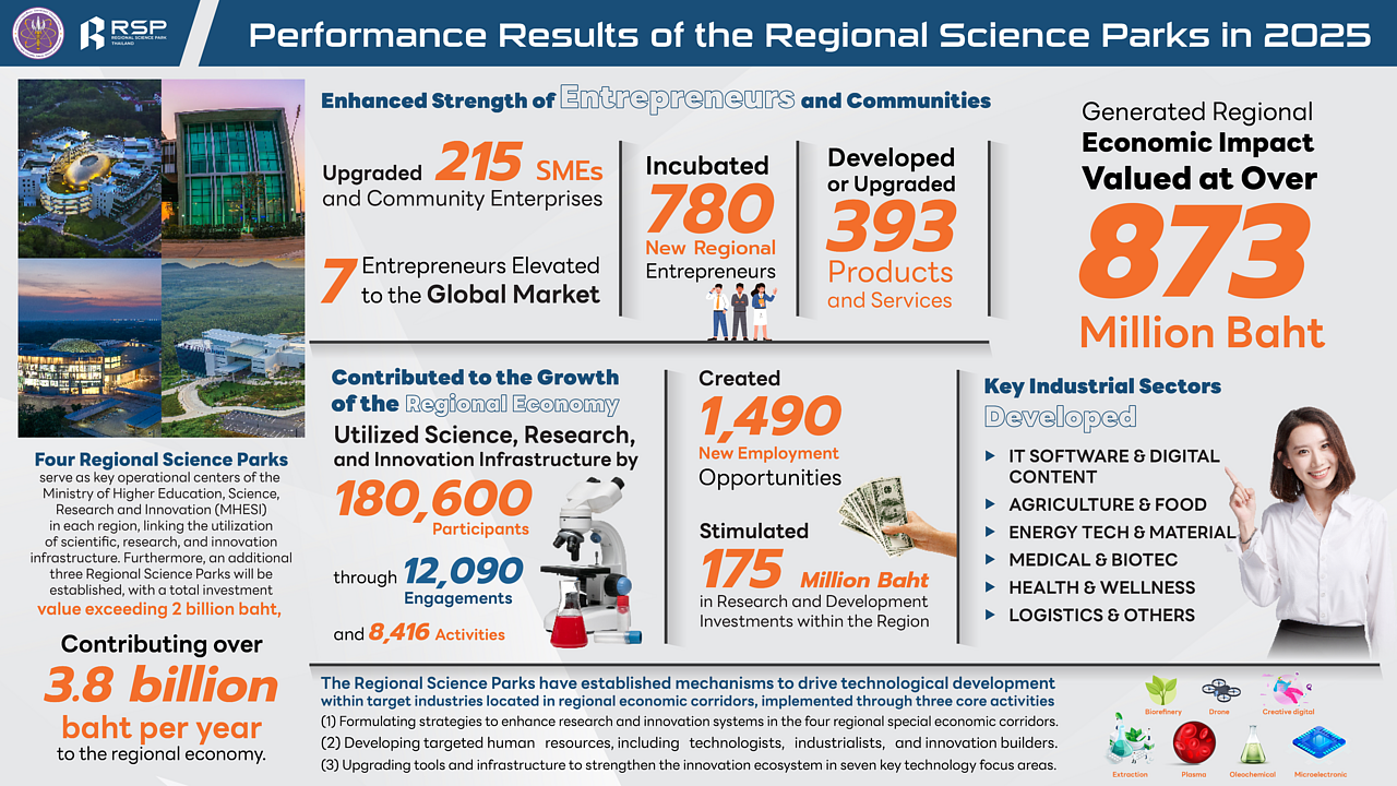 The Regional Science Parks (RSPs) continue to strengthen Thailand’s innovation-driven economy by connecting science, technology, and entrepreneurship. Through a network of regional hubs, RSPs serve as engines for business transformation, talent development, and technology-based growth.