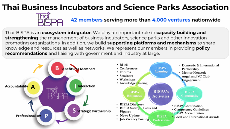 Thai-BISPA is a not-for-profit organization initially comprised of Business Incubators and Science Parks in Thailand. The association is served as a focal point of collaboration, business networking and linkage, knowledge sharing, and capacity development and strengthening for business incubator centers and Science Parks operations in Thailand.