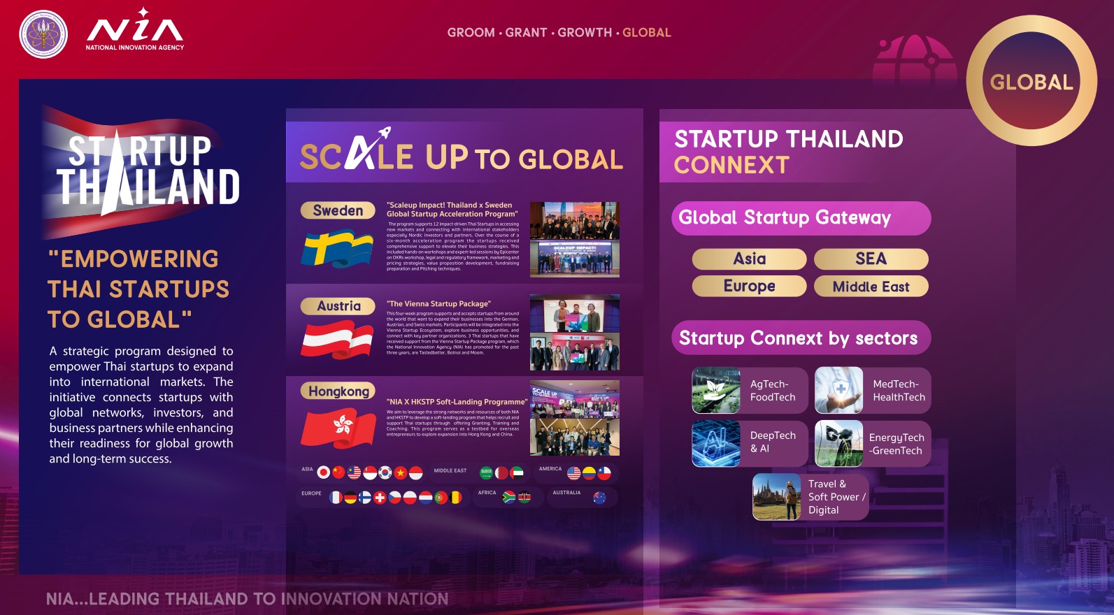- Global คือ เพื่อเชื่อมโยงนักนวัตกรรมไทยสู่เวทีโลก
